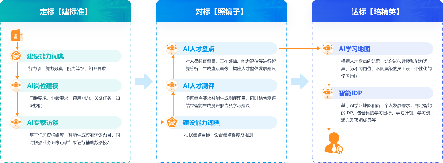 AI+學習發展平臺以AI數字化平臺為核心,搭建人才盤點、培訓資源、運營、可視化數據為一體的賦能體系。
